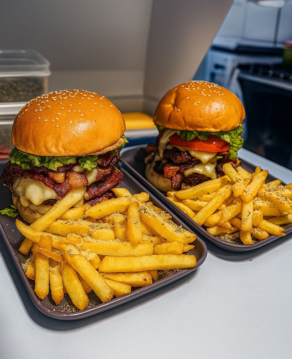 PÃO , DOIS HAMBÚRGUERES DE 120 GRAMAS , 6 FATIAS DE CHEDDAR E 8 FATIAS DE BACON ( EM MÉDIA , CONFORME TAMANHO DA FATIA)!